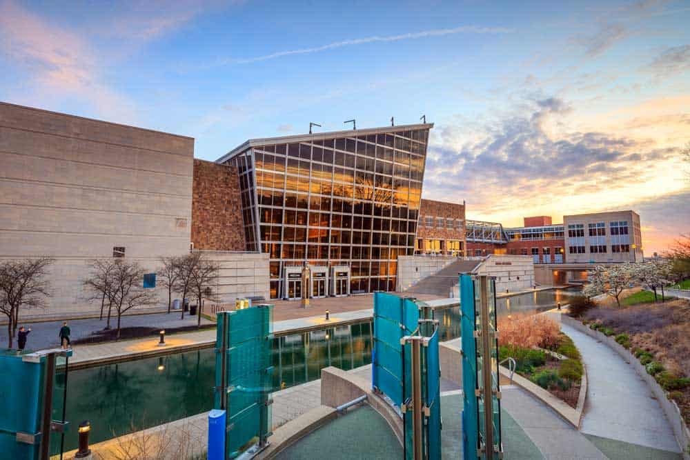 Nestled harmoniously within its surroundings, the striking design of the Indiana State Museum features a unique exterior adorned with rock formations and flowing waters, serving as a homage to Indiana’s geological history.